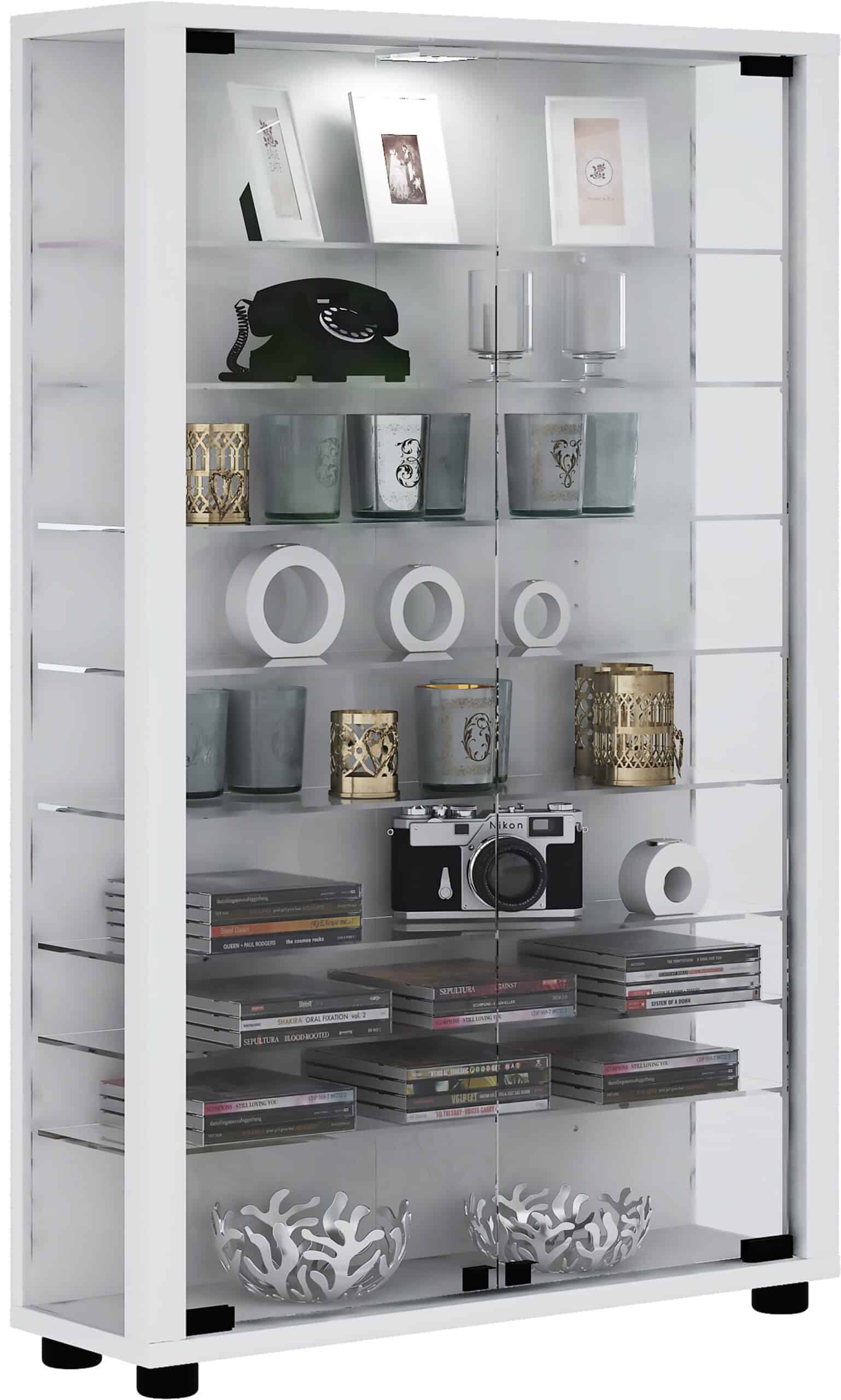 standskab “Lumo Mini”. – Inklusive LED-belysning – Til modelbiler, figurer, tog, kosmetik, krystaller, ure, muslinger osv. Almindelig universal. – Vitrineskabet indeholder 8 variable glashylder og 2 døre af ESG-forstærket sikkerhedsglas, 4 møbel