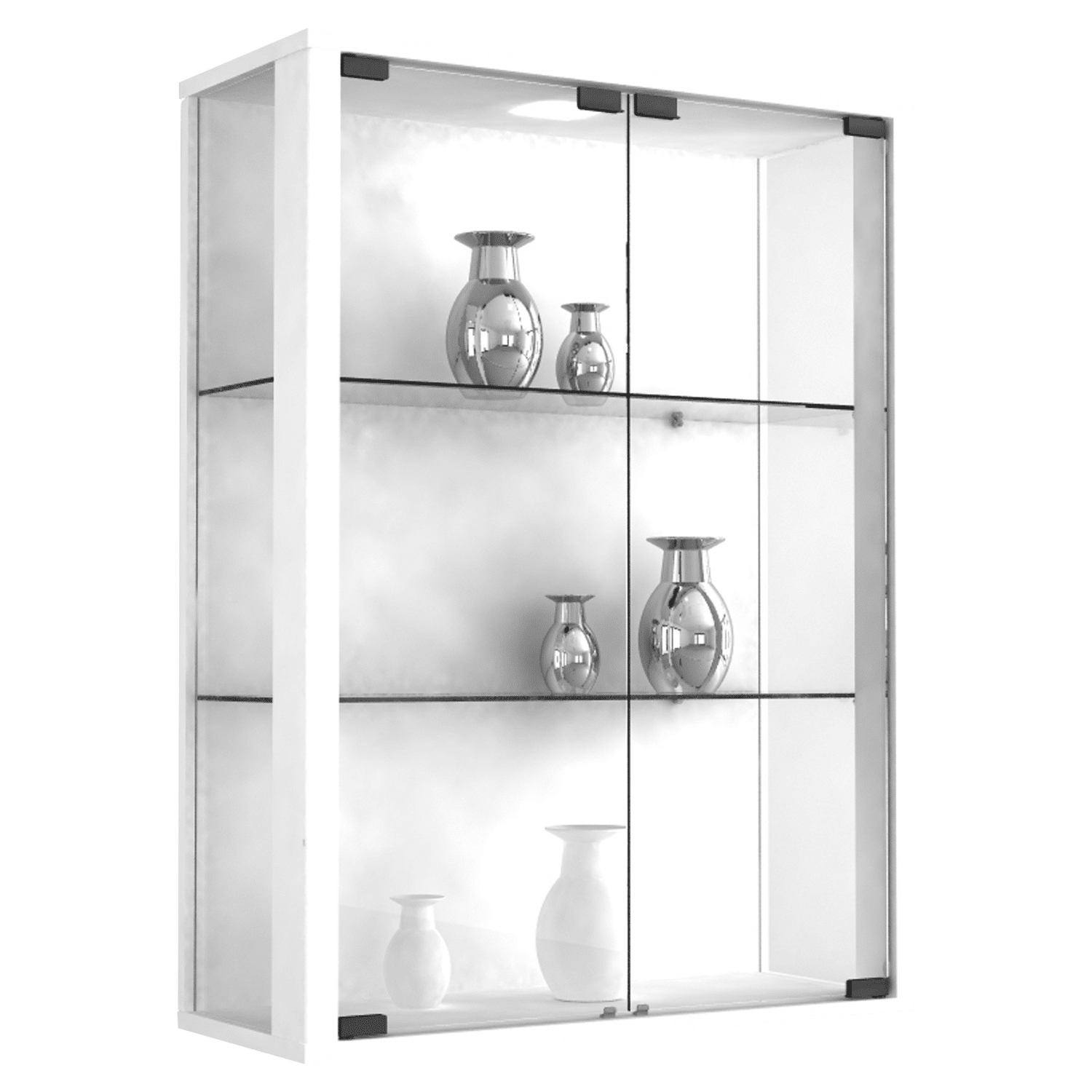 Glasmontre til udstilling Glasmontren omfatter 2 variable glashylder og 2 døre af ESG-sikkerhedsglas. Mål: Højde 80 x bredde 60 x dybde 25 cm. Efterligning af træstruktur. Maksimal belastning: 20 kg. Farve: hvid