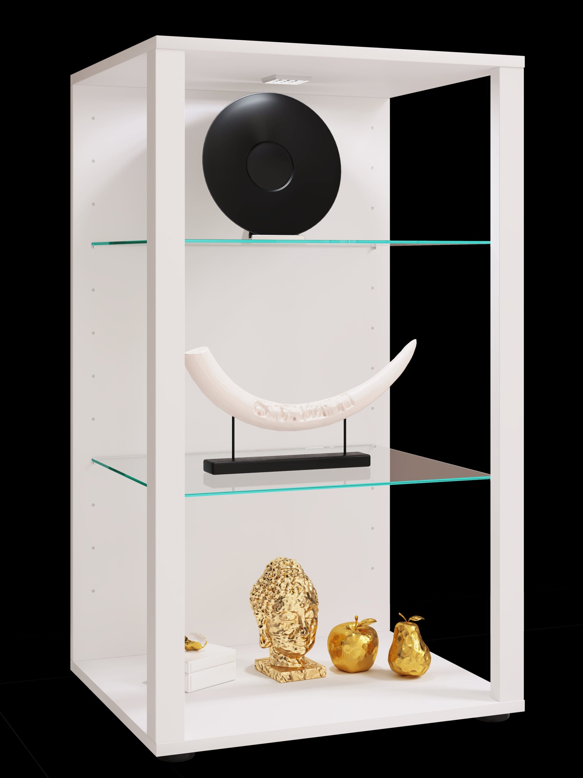 Højdepunkter: – To glashylder – Individuelt justerbare hylder – Mål H. 90 x B. 52 x D. 44 cm Med “Glasol XL” kollektionsmontren har designeren smukt kombineret funktion og udseende. To smalle tværstænger giver kollektionen et særligt look. Glash