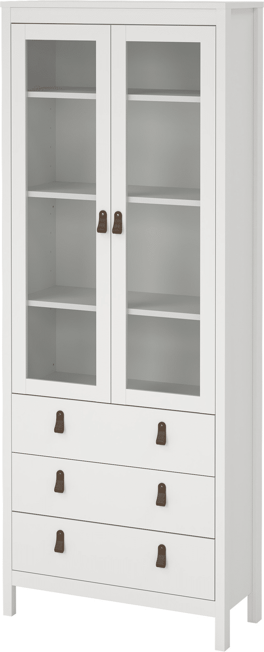 Vitrineskab Vesterholm Lunor – glasvitrine, hvid, 2 glasdøre, 3 skuffer, spånplade, H199ÃB78ÃD32 cm, FSC, klar til vægmontering