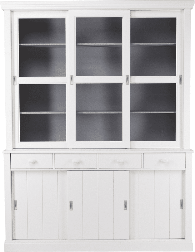 Vitrineskab WOOOD Lagos i hvidt fyrretræ med 3 glas-skydedøre & 4 skuffer – 166Ã48Ã214 cm